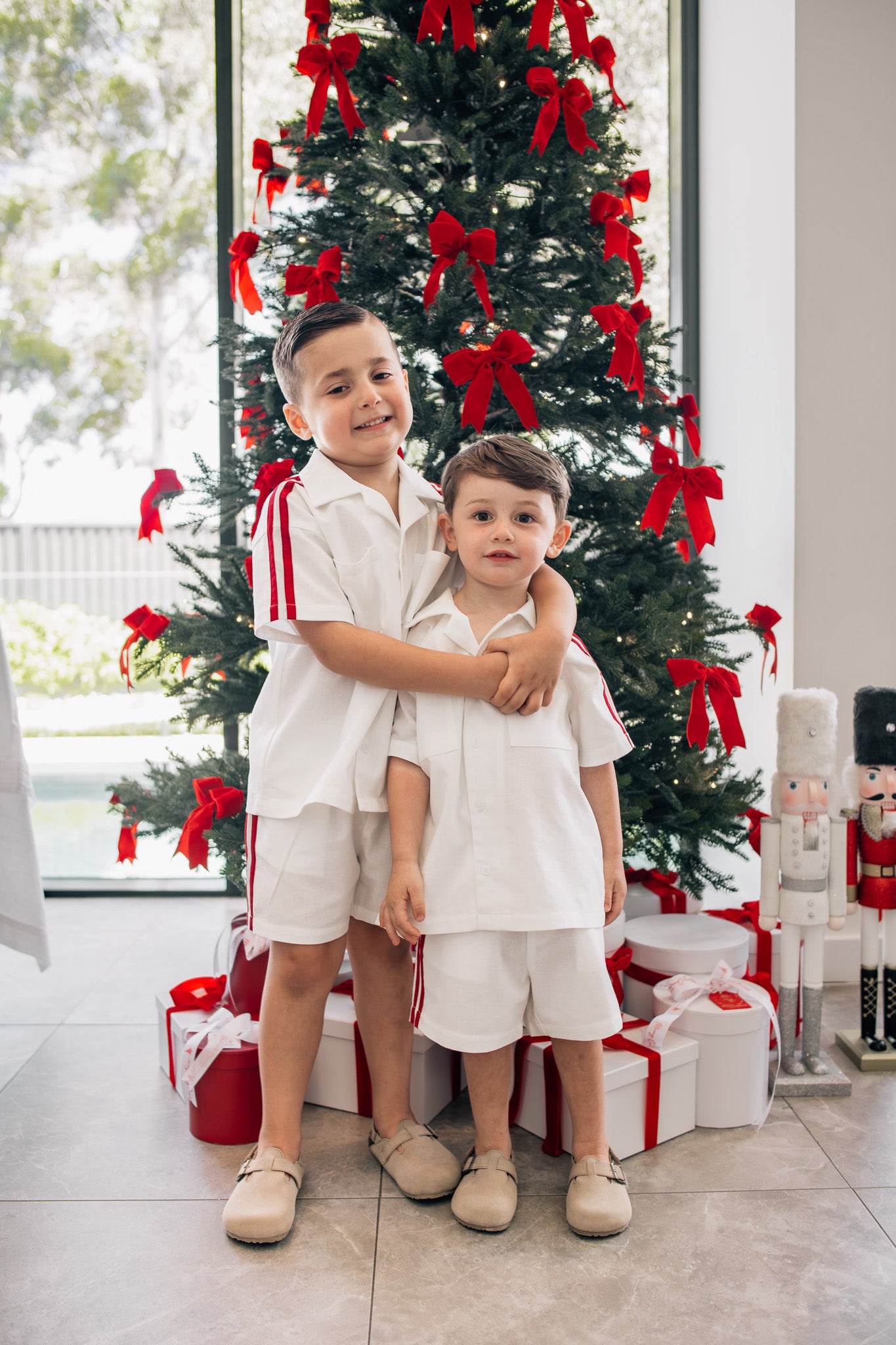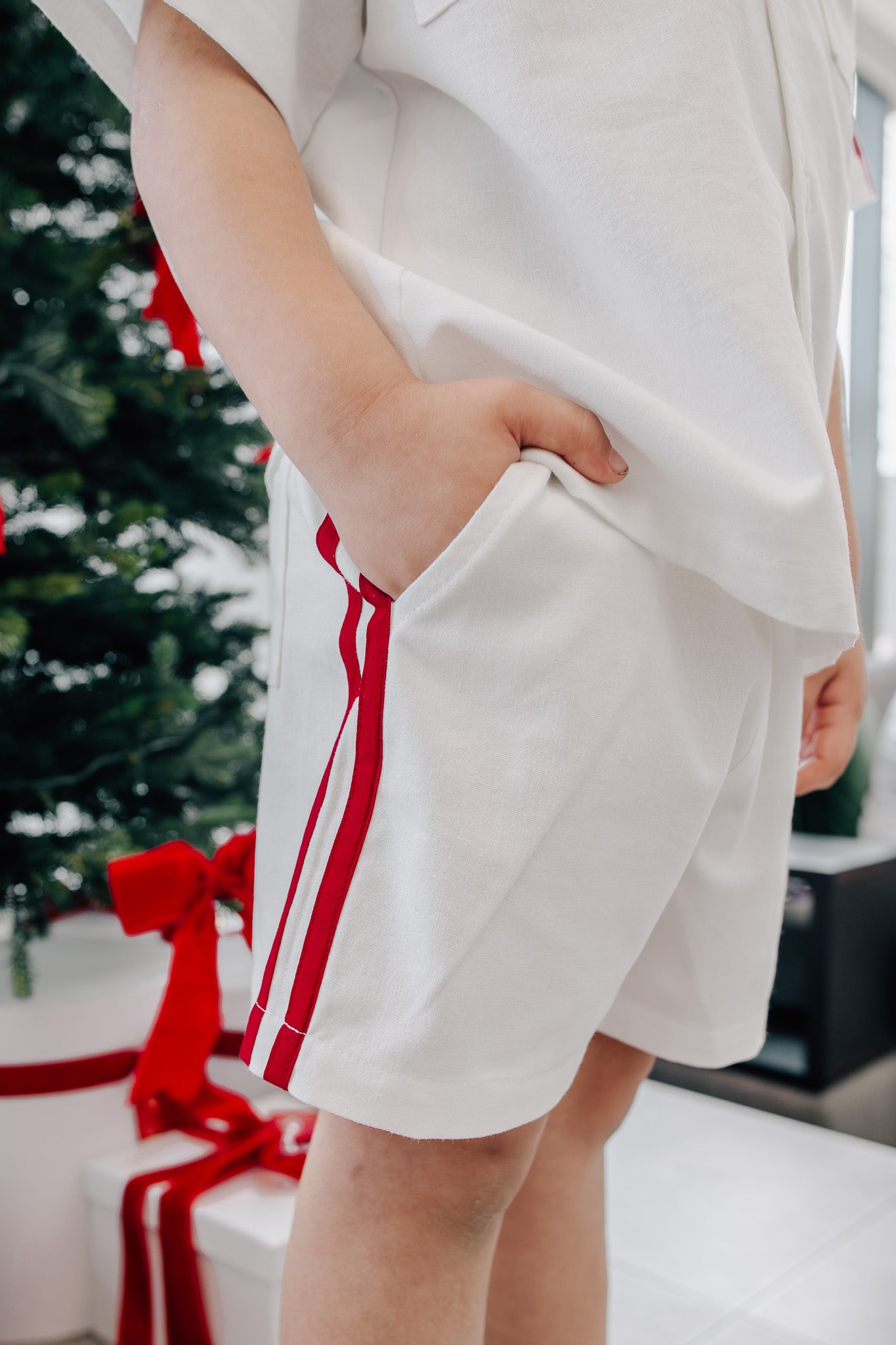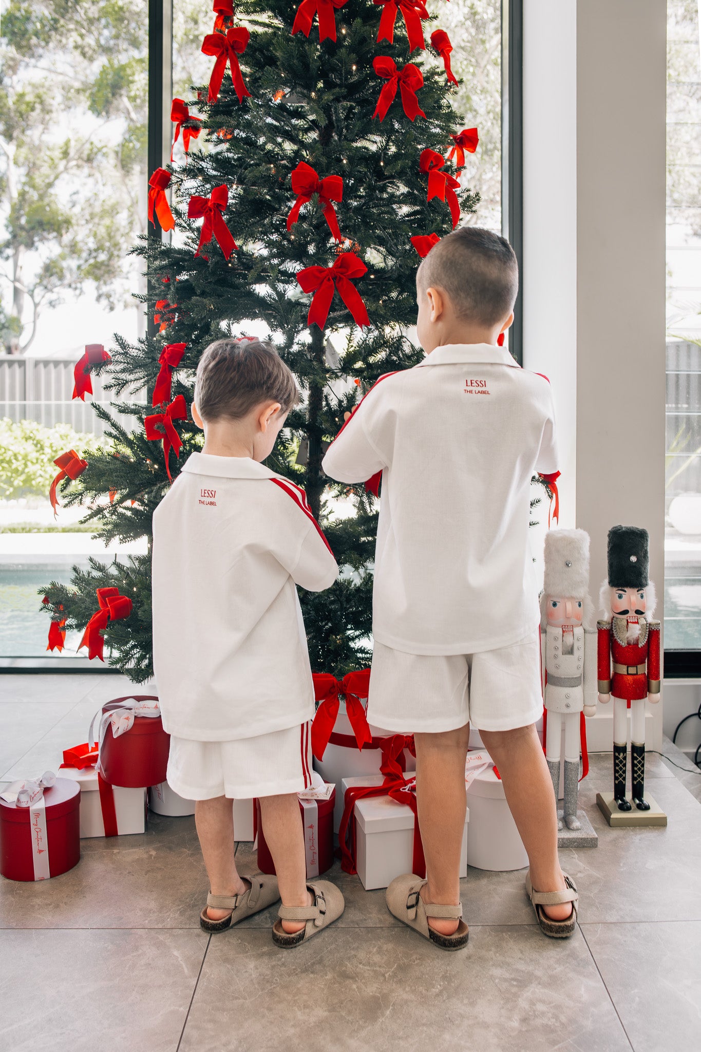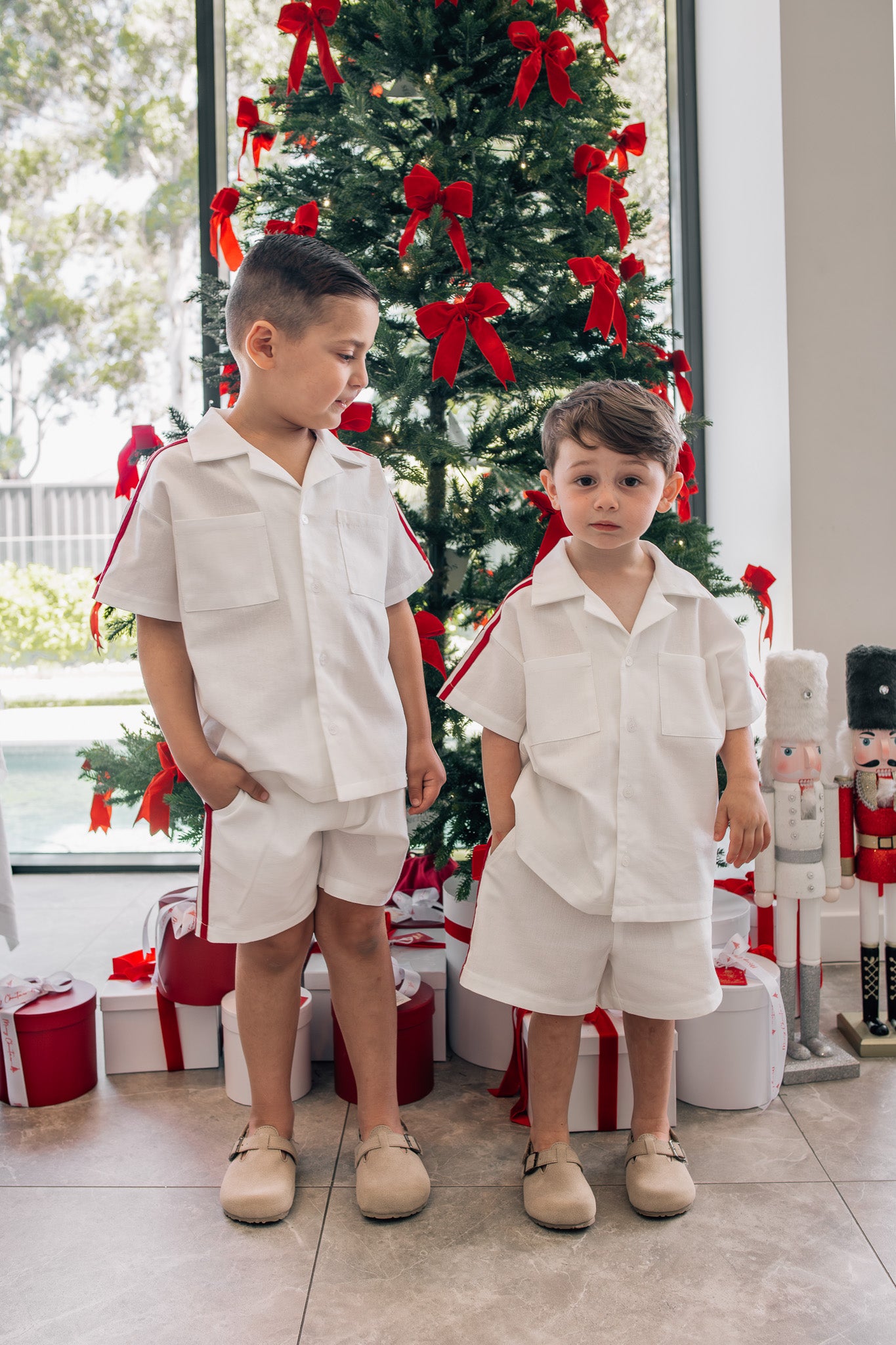 Keep him cool and stylish in our boy's matching shirt and shorts set, featuring classic red detailing. Made from a breathable cotton-linen blend for all-day comfort and effortless wear. Perfect for special occasions or sunny days out, with a timeless, polished look.