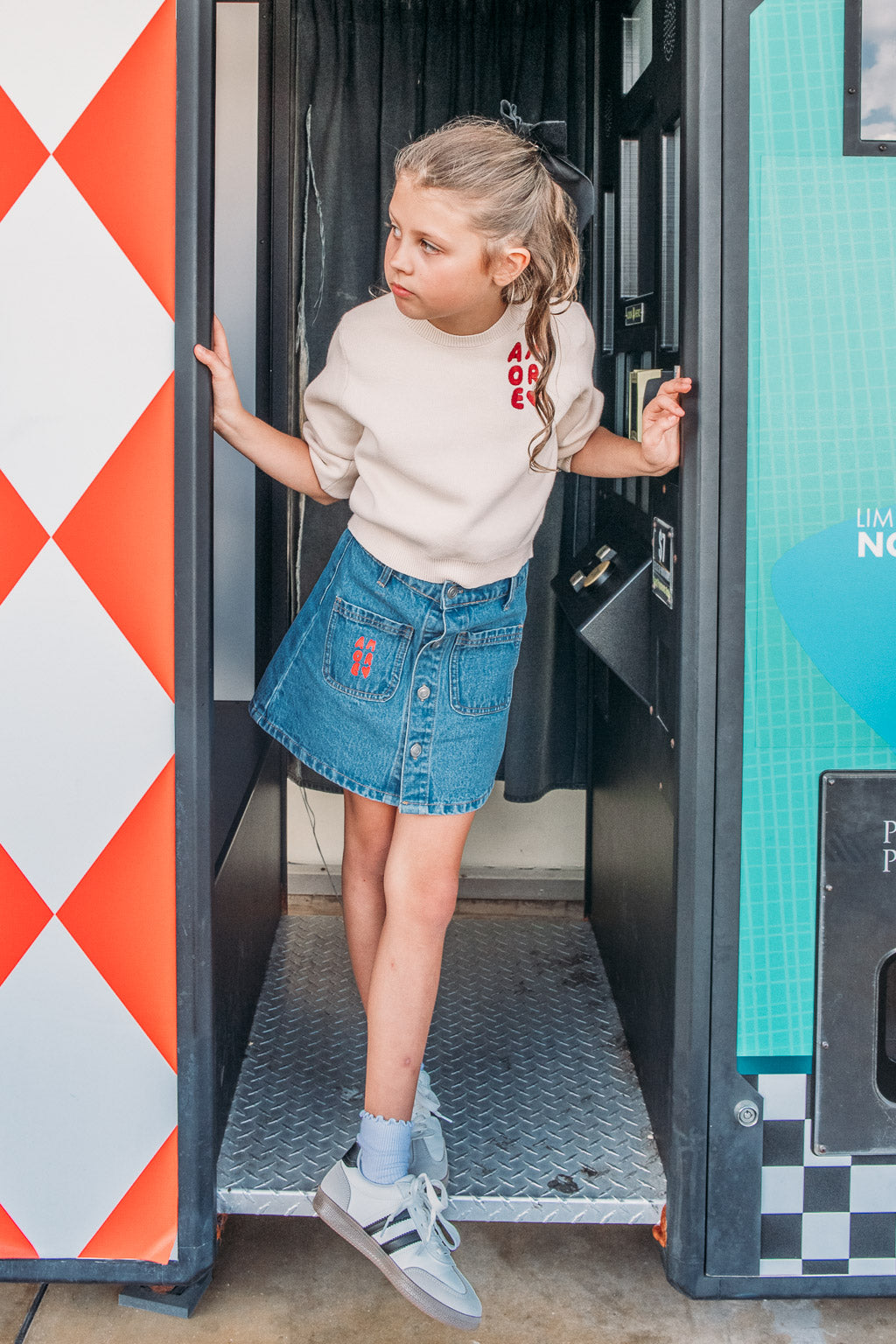 The Felice Denim Skirt is a must-have for little ones who love to mix comfort with style. Crafted from soft denim, this skirt features an elastic back waistband for a comfy fit and handy pocket details for a touch of practicality. The playful Amore print adds a charming