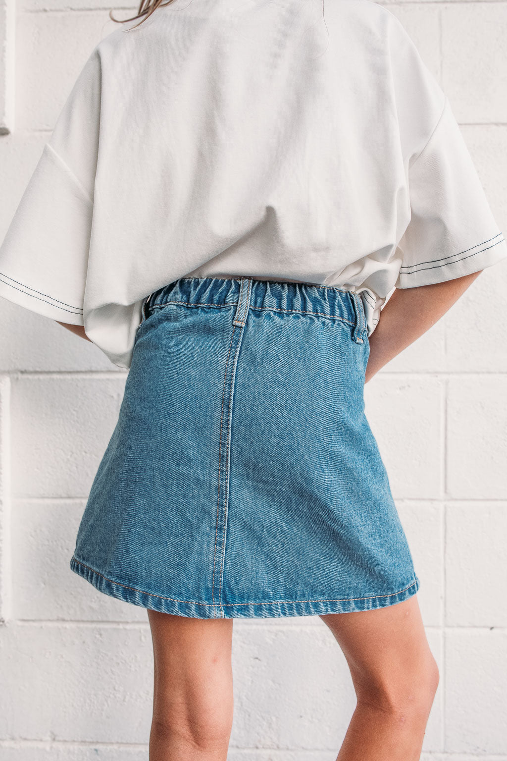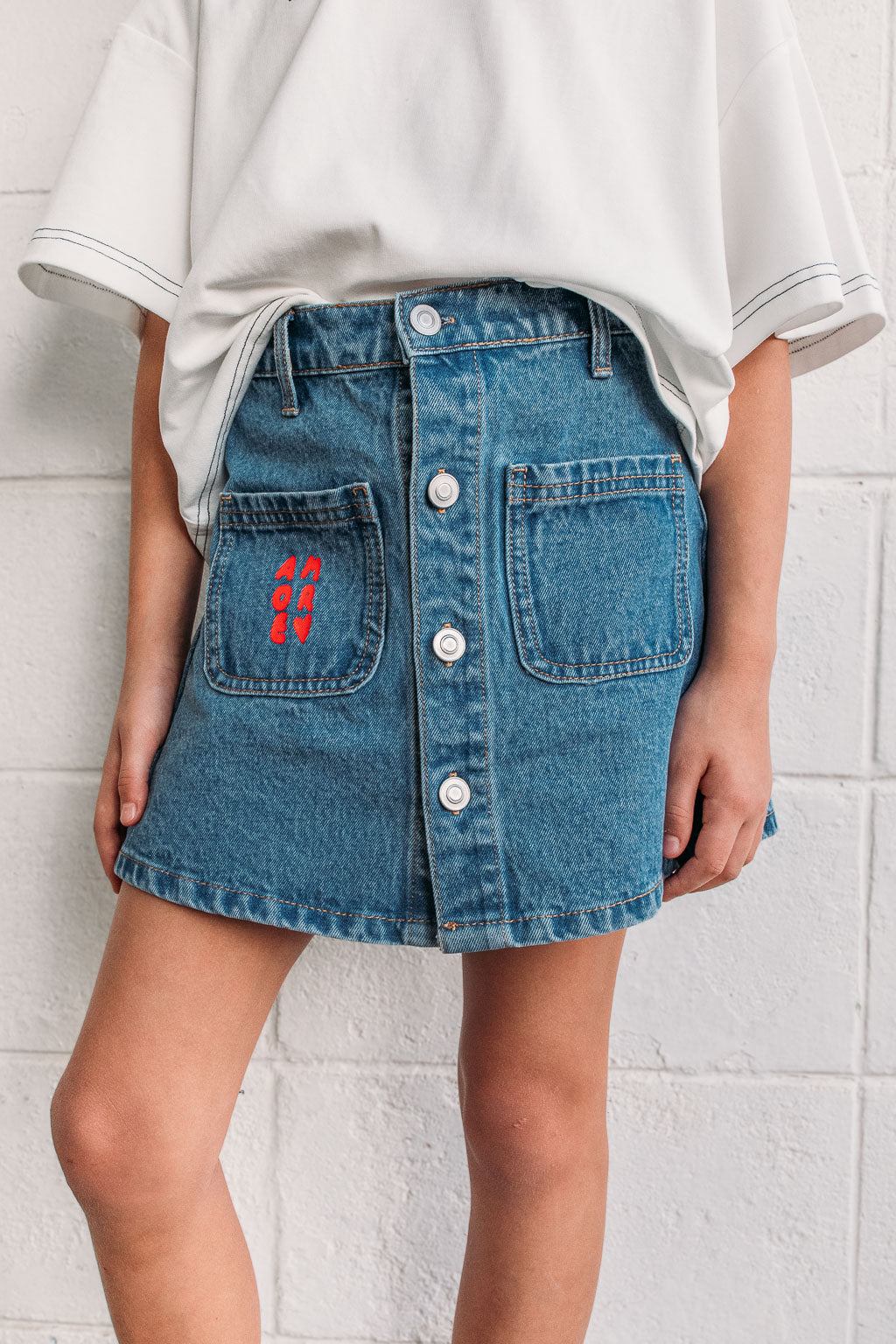 flair, making it a perfect match for the Gracie Denim Jacket for a chic, coordinated look. Whether dressed up or down, the Felice Denim Skirt is a versatile piece that adds a dash of Italian-inspired sweetness to any outfit.