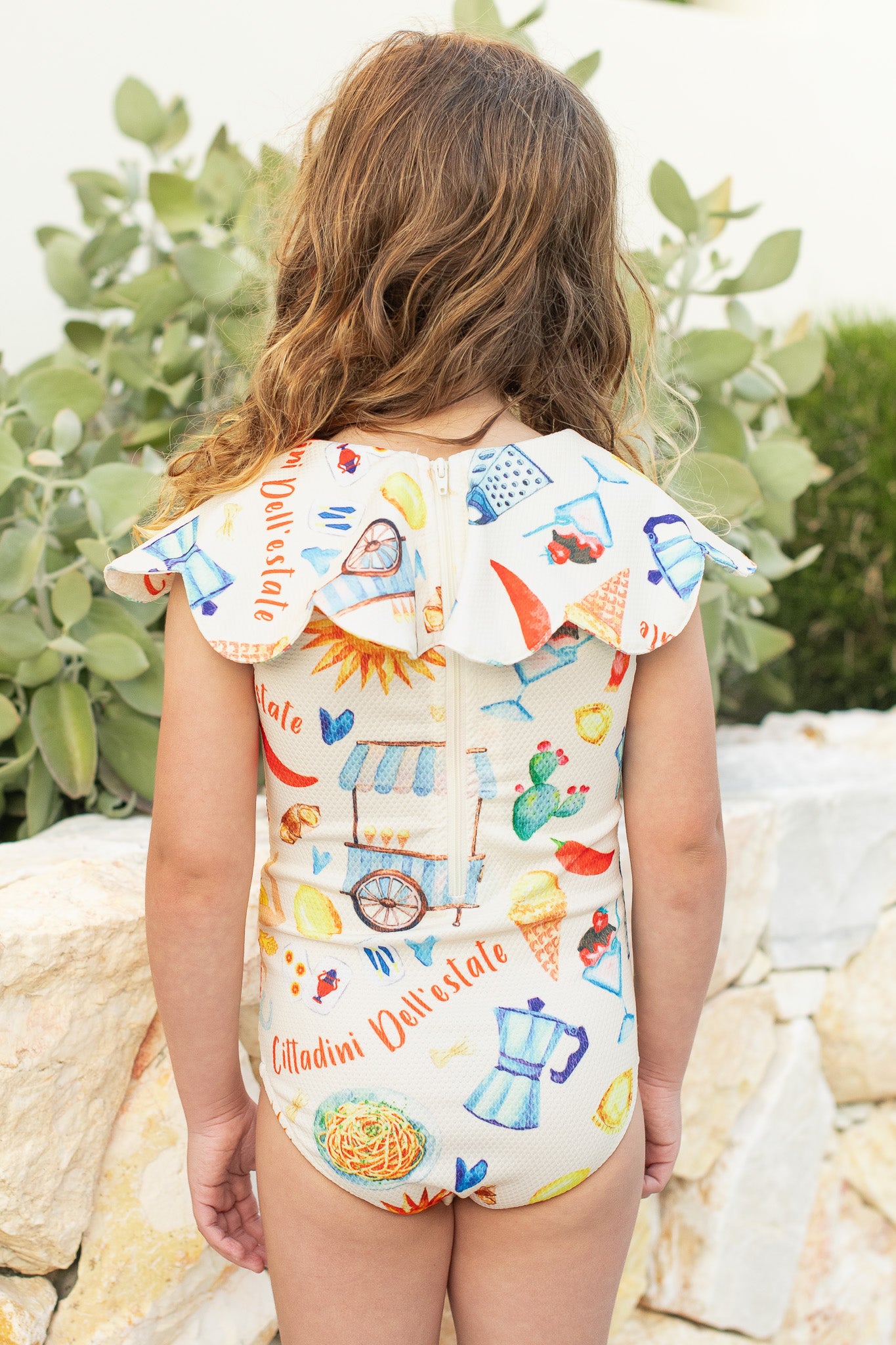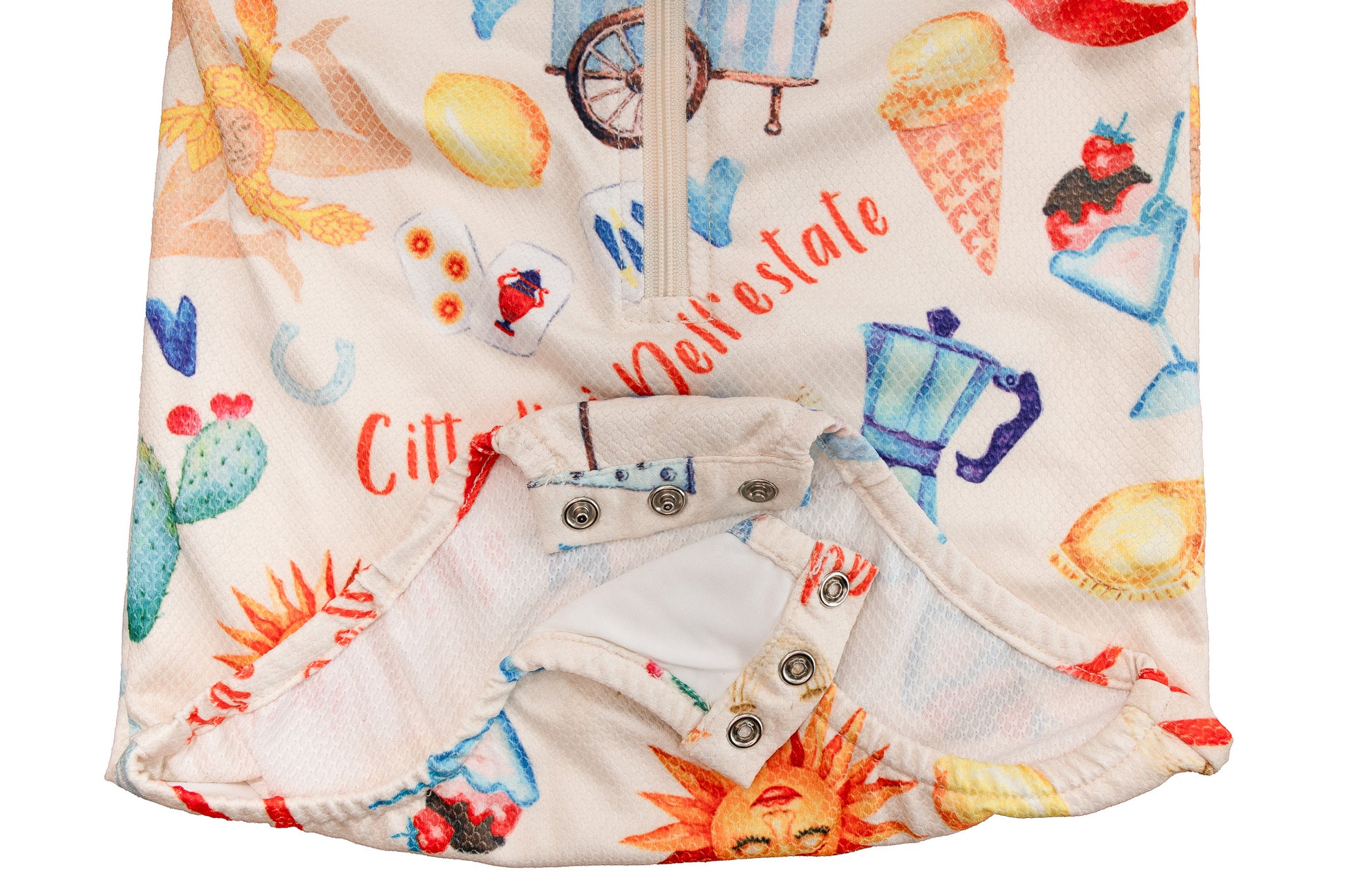 Channel the charm of Sicily with our one-piece swimsuit, adorned in our exclusive Sicilian print. Thoughtfully designed with a scalloped collar, back zipper, and clip bottom for easy changes. Perfect for sun-soaked days and seaside strolls in estate.