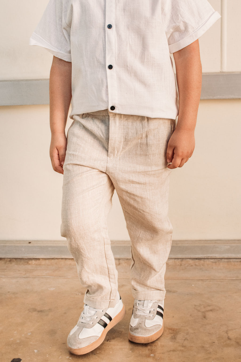 Our linen trousers offer the perfect blend of effortless style and all-day comfort. Designed for movement and breathability, their lightweight fabric keeps up with every adventure—whether it’s seaside strolls or family gatherings under the sun. A timeless staple for your little explorer.